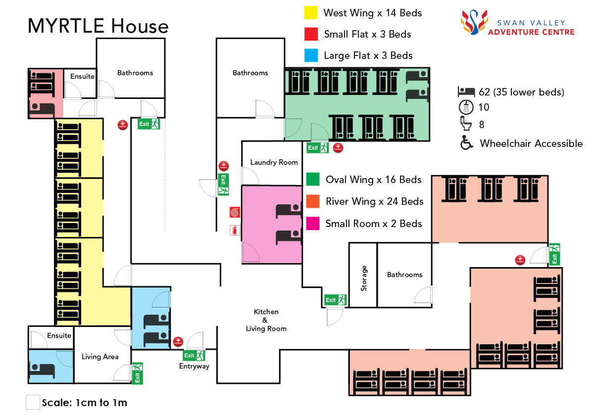 Myrtle is a single-story camp house with 62 beds with 54 bunk beds. Myrtle has one universal access and two rooms with ensuites.